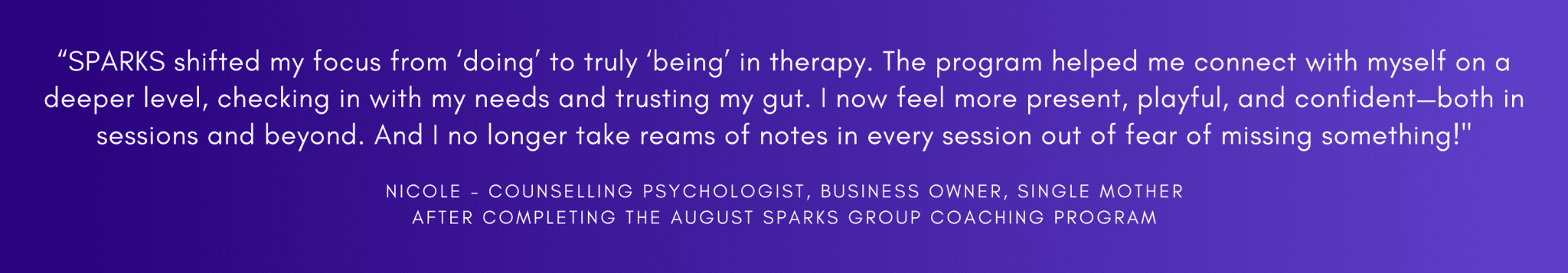 While SPARKS was designed by a therapist and with therapists in mind, many of the insights and tools can benefit anyone in a caring profession, including teachers, first responders, and other healthcare workers. SPARKS tackles underlying patterns of self-sacrifice and perfectionism that often lead to burnout, so if that resonates with you, you’re most welcome here!