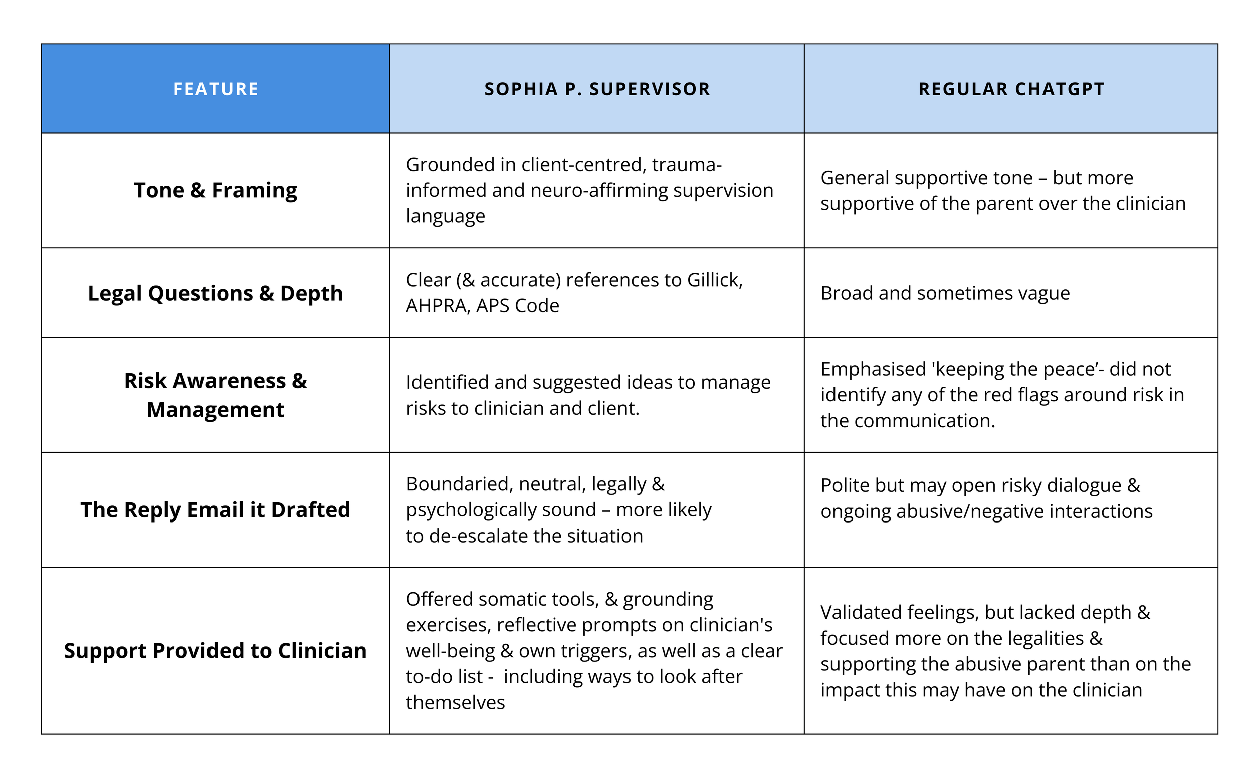 Clinicians, too, are at risk of mistaking smooth, affirming language for sound clinical guidance - especially when under stress or navigating tricky dynamics. That’s why I tested a real-life supervision scenario with two different ChatGPT: once using a generic, free version of ChatGPT, and once using Sophia P. Supervisor, a custom-built chatbot I built and trained on supervisory principles, psychotherapeutic foundations, and our Australian ethical guidelines.